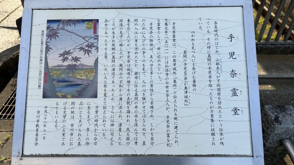 さまざまな伝説を纏いながら万葉集にうたわれ日本文学にも影響を及ぼした女性、手児奈の墓所に建てられたというお堂です。長い石畳の参道の手前に真間万葉歌顕彰碑や説明パネルがあります。安産や縁結びにご利益があるそうです。