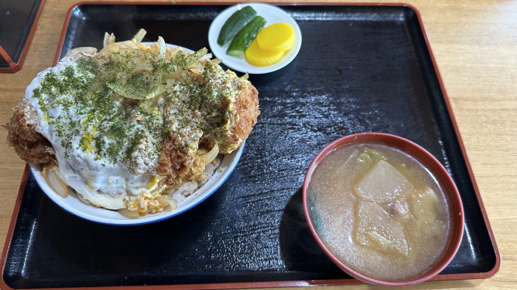 カツ丼すごい分厚いのにちゃんと中まで火が通ってて柔らかい🤤夫は結構大食いなのに食べ終わったら苦しいって言ってたアジフライも頼んだら売り切れでエビフライにしたらこれも大きくてプリプリでおいしかったです☺️ティックトックで宣伝してたせいか駐車場がいっぱいでもう少し広ければなと思いました
